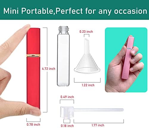 The Refillable Perfume Spray volume is 12ml/pcs. TRAVEL SIZE 4.72x 0.78 x0.78 inches.0.95 ounces,it can easily fit in your pocket, purse, handbag or backpack, super convenient to use in your daily life.perfume bottle with funnel,perfume bottle with dropper,6 x Portable Perfume Atomizer Bottle(Purple/Red/Blue/Pink/Silver/Gold), 2 x funnel, 2 x dispenser tool