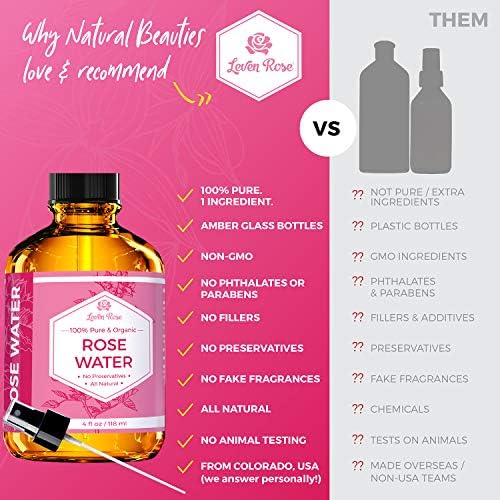 NOTHING ADDED OR TAKEN AWAY. Dark amber bottle extends shelf life as oils and Rosewater are light sensitive & must be stored in dark amber bottles to protect organics from oxidation. Organics not packaged in dark bottles for storage will lose potency & become non effective from UV damage. Store in a dry cool place out of direct sunlight. Leven Rose is committed to your 100 percent satisfaction.